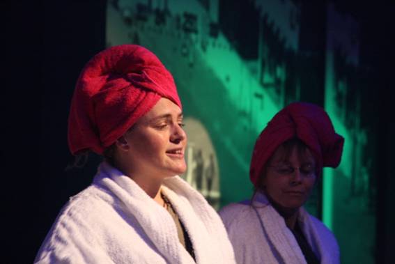 de roze handdoeken om het haar gewikkeld, de roze badslofjes gaan aan. Aldus